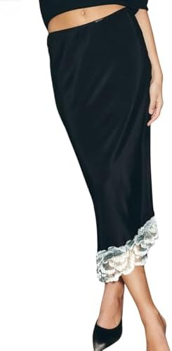Women Lace Trim Satin Long Skirt Asymmetrical Silk Lace Skirt Elegant Elastic Waist Flowy A Line Midi Underskirt